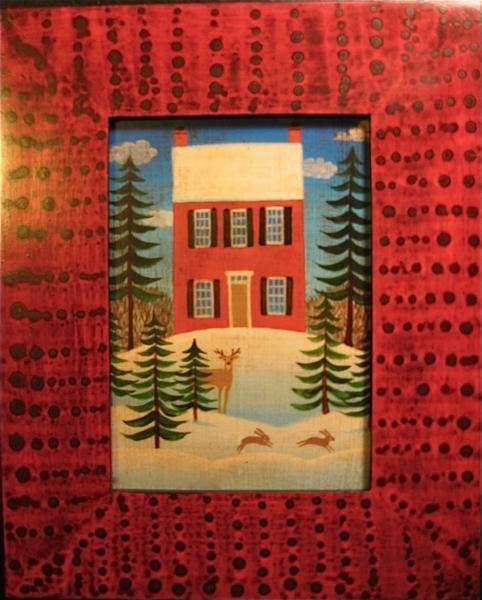 This 5"x7" original acrylic painting with a crackled finish is a cheerful view of winter, with a bright sky, deer peeking out from the firs trees and rabbits scampering across the scene. It is set in a 2" hand-painted faux-grained frame.
