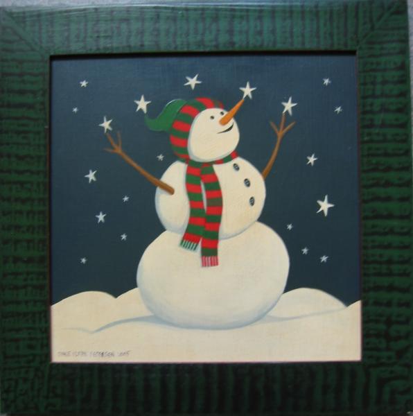 Who knows what snowmen do at night when we're not looking! This snowman was published a few years ago by Legacy for its boxed Christmas cards. The 12"x12" original acrylic painting with a crackled finish is set in a 2" green hand-painted faux-grained frame.
