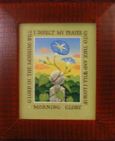 This 8"x10" original acrylic painting of a sky-blue morning glory, showing its face to the morning sun, illustrates the Biblical verse From Psalm 5 surrounding it: O Lord in the morning will I direct my prayer unto Thee and will I look up. It is in a 2" frame with hand-painted faux-finish.