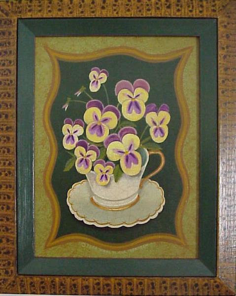 This 9"x12" acrylic painting of purple and white pansies, all showing their sweet faces to brighten your day, is framed in a 2" double-beveled frame with a green inner edge and a faux-grained outer edge. A crackled finish and oil glaze adds texture and age.